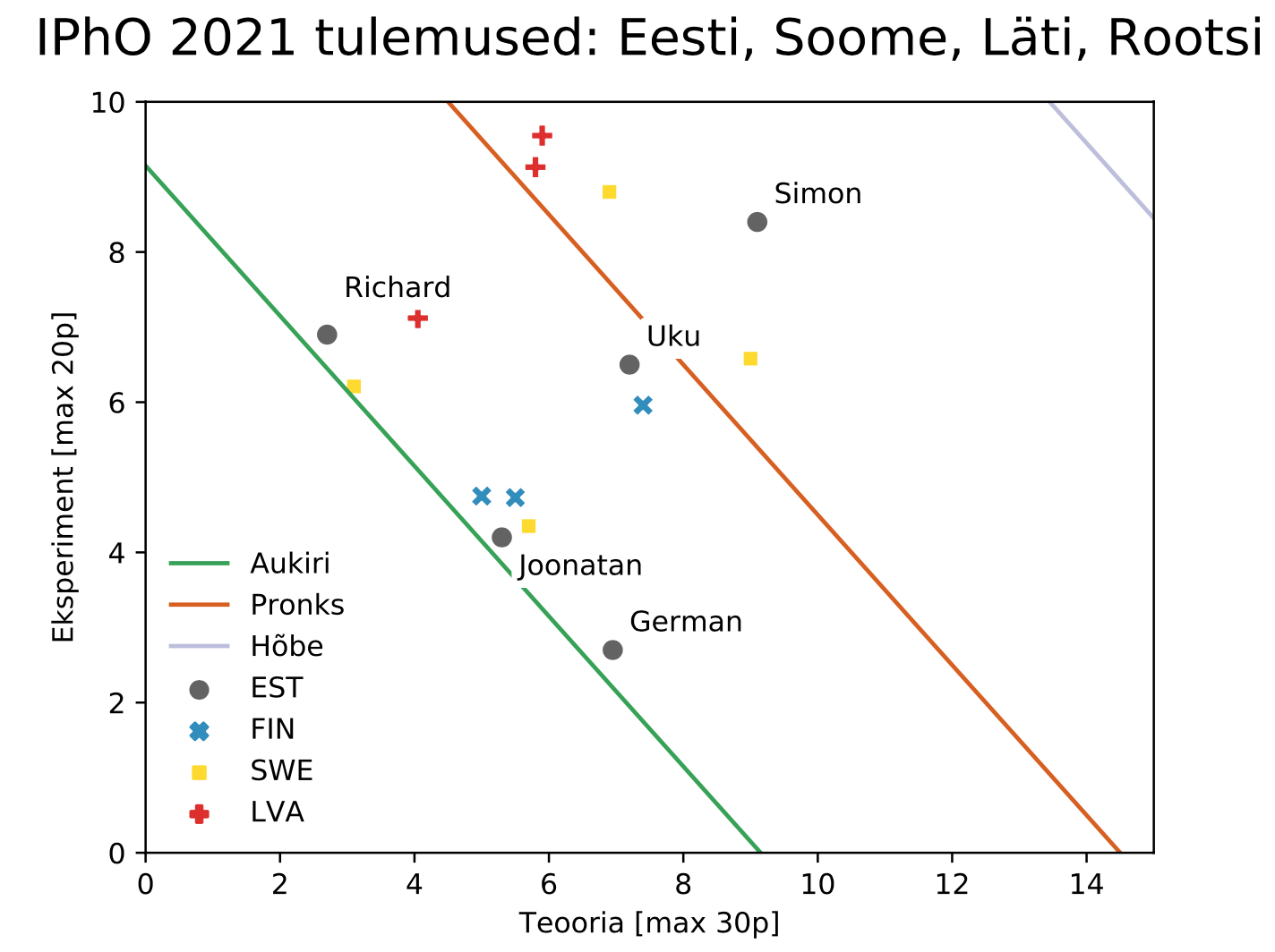 Alloleval graafikul on näha Eesti õpilaste tulemusi võrdlevalt meie läbinaabrite Soome, Läti ja Rootsiga, kellega ühiselt Põhja-Balti olümpiaadil IPhO võistkondade koosseisud välja selgitasime. Võime tõdeda, et saavutasime naabritega võrreldes üsna sarnaseid tulemusi. Kui meie õpilastest jõudsid auhinnaliste kohtadeni kõik viis, siis naabritel kolm või neli õpilast. Graafikul esitatud diagonaaljooned tähistavad teooria- ja eksperimendipunktide koondsummat, mis vastavad aukirja ja pronksmedali piiridele.